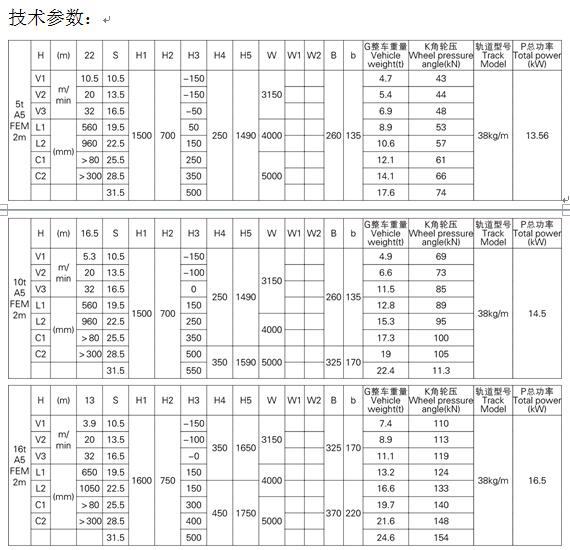 3、表中的尺寸,重量,輪壓供客戶訂貨時參考,如果客戶的需要條件發(fā)生變化,如工作級別,速度,起升高度有變化時,相應的參數(shù),尺寸,重量,輪壓等都會發(fā)生變化,實際的參數(shù),質量,輪壓以合同的要求為準。