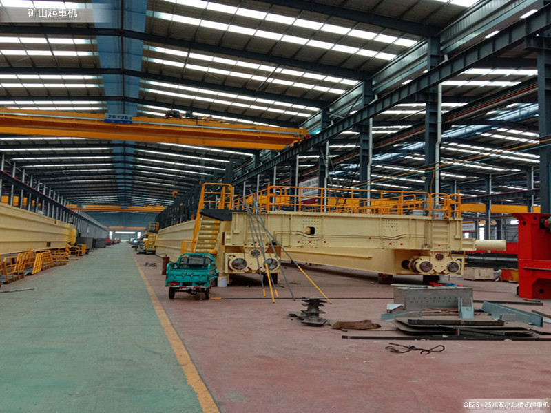 QE25+25噸雙小車雙梁橋式起重機(jī)的雙主梁上運(yùn)行兩個(gè)起重小車,主要用于抬吊比較長(zhǎng)的加工件,比如水泥線桿,也稱作桁吊、天車。