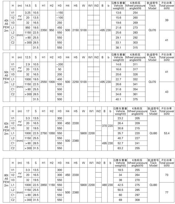 3、表中的尺寸,重量,輪壓供客戶訂貨時參考,如果客戶的需要條件發(fā)生變化,如工作級別,速度,起升高度有變化時,相應的參數(shù),尺寸,重量,輪壓等都會發(fā)生變化,實際的參數(shù),質量,輪壓以合同的要求為準。